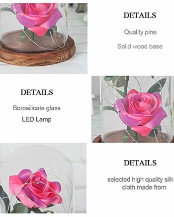 Rose de haute qualité: le dôme en verre est fait de verre à haute teneur en borosilicate, plus transparent et plus beau. La chaîne de LED est faite avec un fin fil de cuivre que vous pouvez créer par vous-même, ce qui ajoute une touche décorative. La base est en bois de pin, ce qui est plus stable, traitement fin, surface lisse sans bavure.